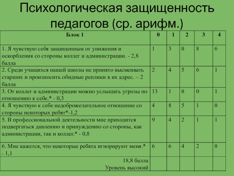 Слайд 21Психологическая защищенность педагогов (ср. арифм.)