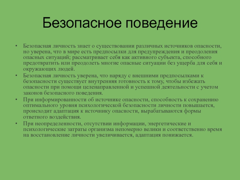 Безопасная личность уверена, что наряду с внешними предпосылками к безопасности существует внутренняя готовность к тому, чтобы избежать опасности при помощи целенаправленной и успешной деятельности с учетом законов безопасного поведения.