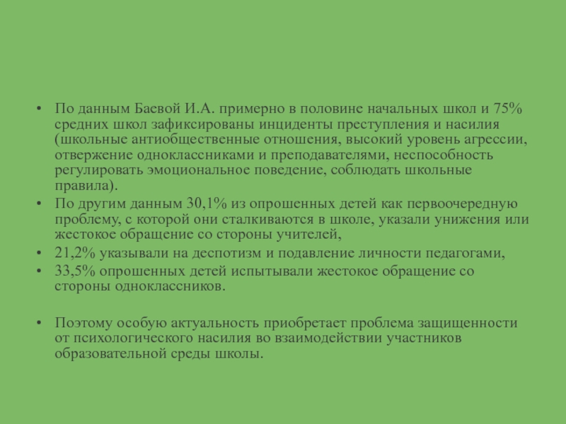 Поэтому особую актуальность приобретает проблема защищенности от психологического насилия во взаимодействии участников образовательной среды школы.