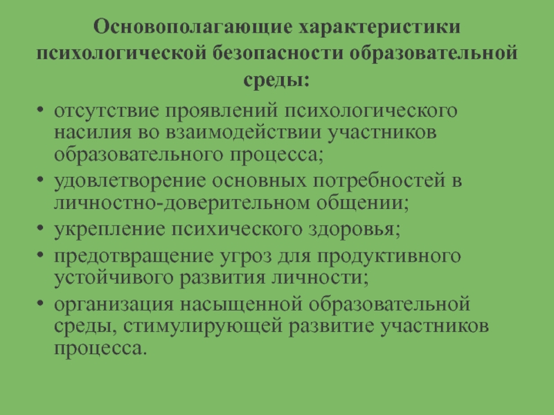 Слайд 31Основополагающие характеристики психологической безопасности образовательной среды: