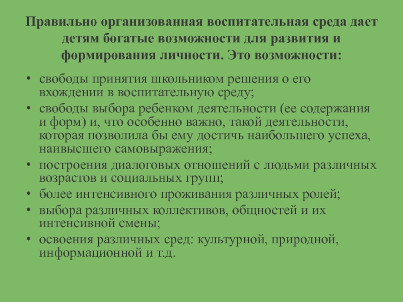 Слайд 32Правильно организованная воспитательная среда дает детям богатые возможности для развития и