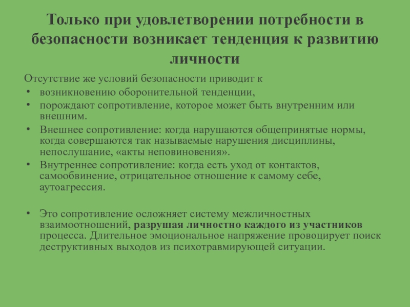 Слайд 5Только при удовлетворении потребности в безопасности возникает тенденция к развитию личности