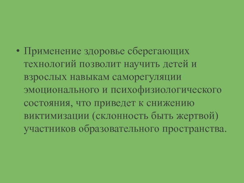 Слайд 25Применение здоровье сберегающих технологий позволит научить детей и взрослых навыкам саморегуляции