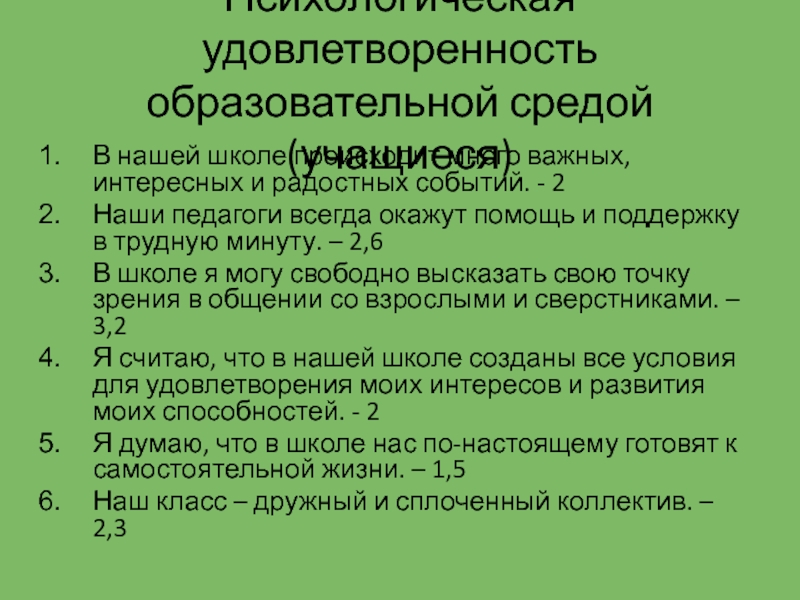 Слайд 18Психологическая удовлетворенность образовательной средой (учащиеся)