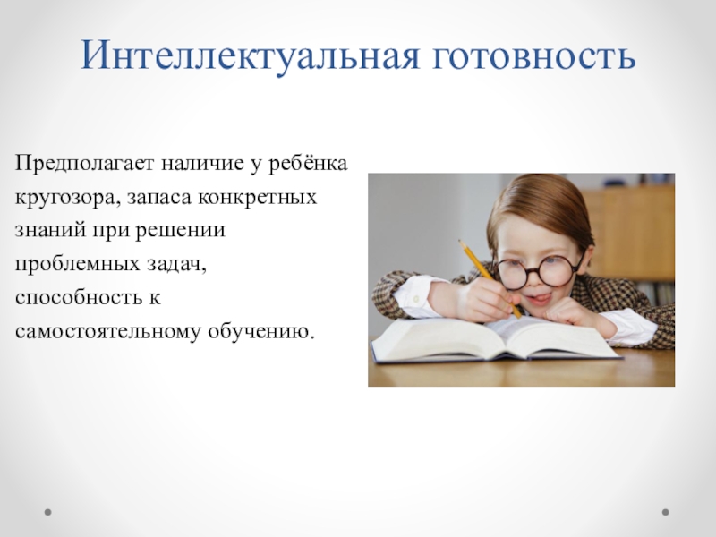 Интеллектуальная готовностьПредполагает наличие у ребёнка кругозора, запаса конкретныхзнаний при решении проблемных задач, способность к самостоятельному обучению.