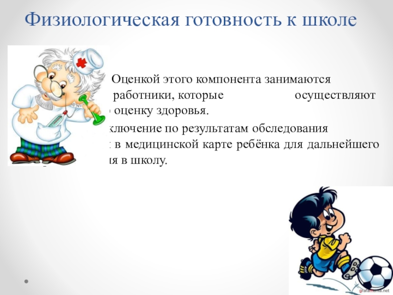 Физиологическая готовность к школе	         Оценкой этого компонента занимаются		 медицинские