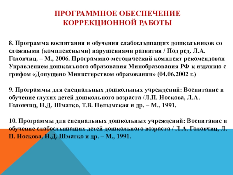 10. Программы для специальных дошкольных учреждений: Воспитание и обучение слабослышащих детей дошкольного возраста / Л.А. Головчиц, Л.П. Носкова, Н.Д. Шматко и др. – М., 1991.