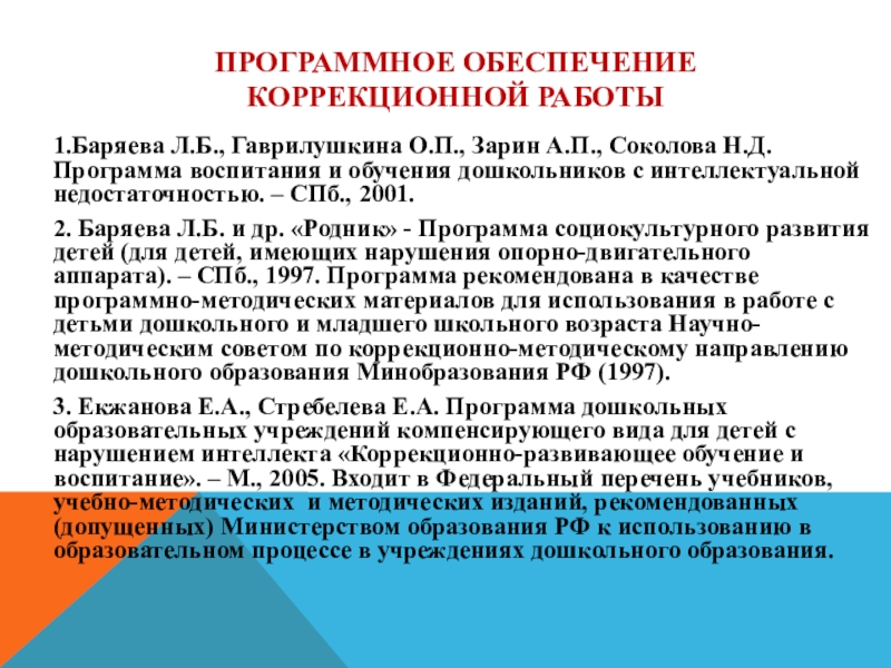 3. Екжанова Е.А., Стребелева Е.А. Программа дошкольных образовательных учреждений компенсирующего вида для детей с нарушением интеллекта «Коррекционно-развивающее обучение и воспитание». – М., 2005. Входит в Федеральный перечень учебников, учебно-методических и методических изданий, рекомендованных (допущенных) Министерством образования РФ к использованию в образовательном процессе в учреждениях дошкольного образования.