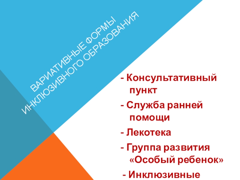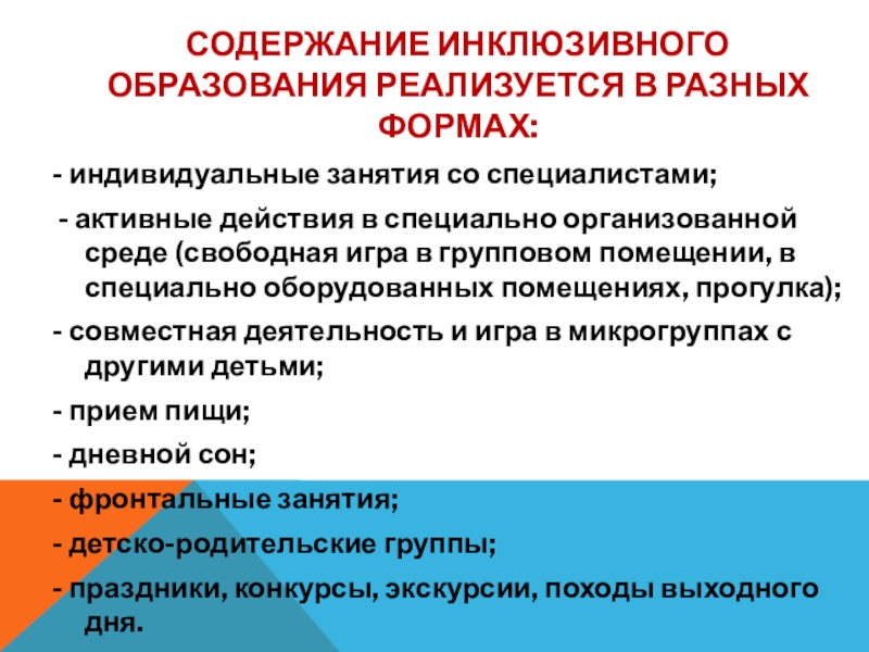 Слайд 28Содержание инклюзивного образования реализуется в разных формах: