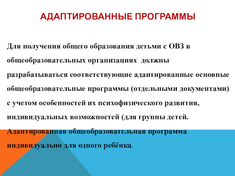 должны разрабатываться соответствующие адаптированные основные общеобразовательные программы (отдельными документами) с учетом особенностей их психофизического развития, индивидуальных возможностей (для группы детей. Адаптированная общеобразовательная программа индивидуально для одного ребёнка.