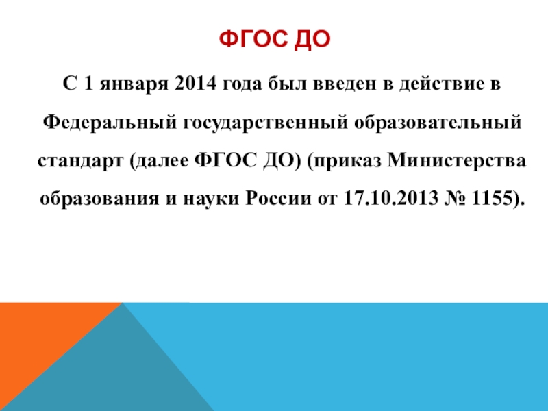 Федеральный государственный образовательный стандарт (далее ФГОС ДО) (приказ Министерства образования и науки России от 17.10.2013 № 1155).