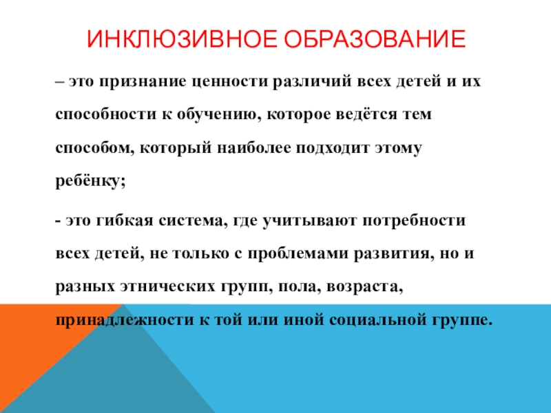 - это гибкая система, где учитывают потребности всех детей, не только с проблемами развития, но и разных этнических групп, пола, возраста, принадлежности к той или иной социальной группе.