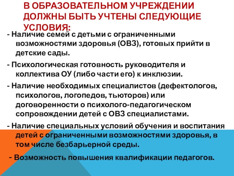 Слайд 24В образовательном учреждении должны быть учтены следующие условия: