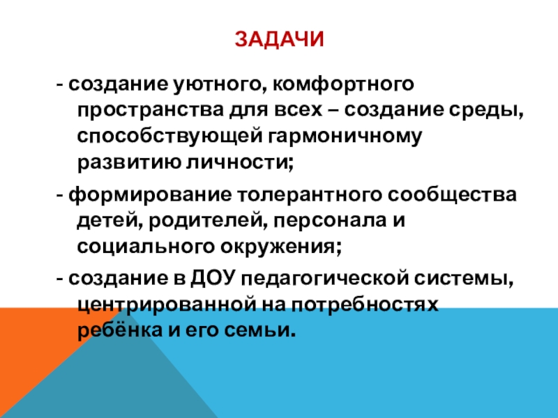 - формирование толерантного сообщества детей, родителей, персонала и социального окружения;