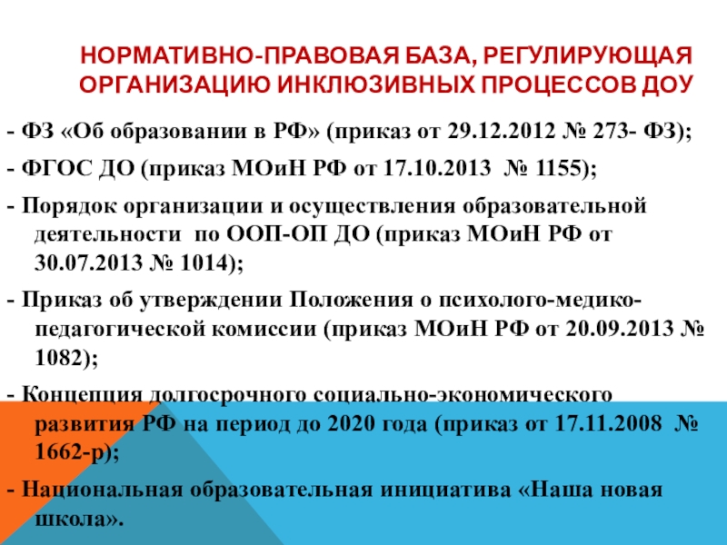 Слайд 3Нормативно-правовая база, регулирующая организацию инклюзивных процессов ДОУ