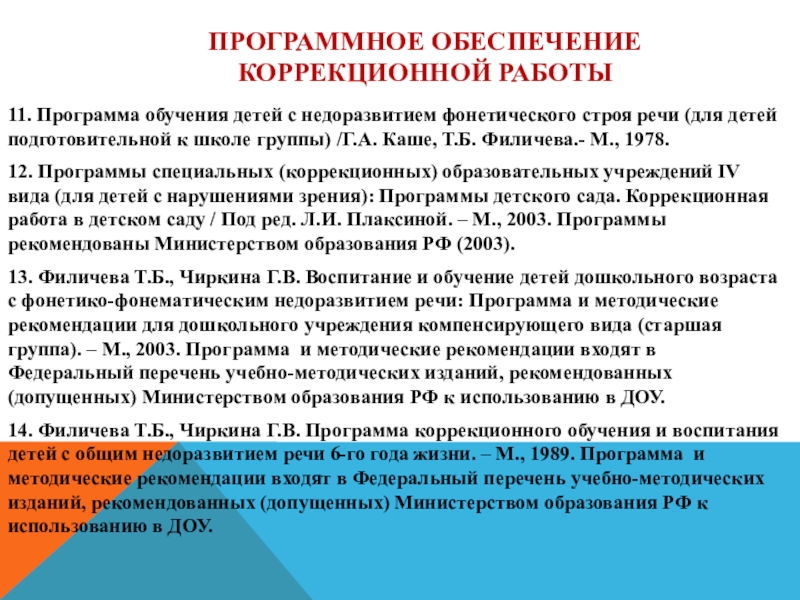 14. Филичева Т.Б., Чиркина Г.В. Программа коррекционного обучения и воспитания детей с общим недоразвитием речи 6-го года жизни. – М., 1989. Программа и методические рекомендации входят в Федеральный перечень учебно-методических изданий, рекомендованных (допущенных) Министерством образования РФ к использованию в ДОУ.