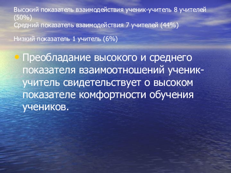 Преобладание высокого и среднего показателя взаимоотношений ученик-учитель свидетельствует о высоком показателе комфортности обучения учеников.