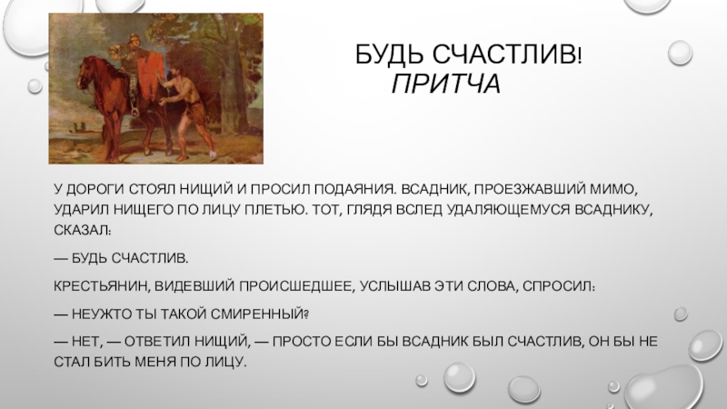 — Нет, — ответил нищий, — просто если бы всадник был счастлив, он бы не стал бить меня по лицу.