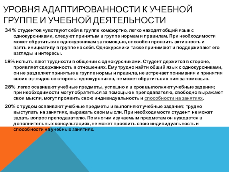 Слайд 7Уровня адаптированности к учебной группе и учебной деятельности