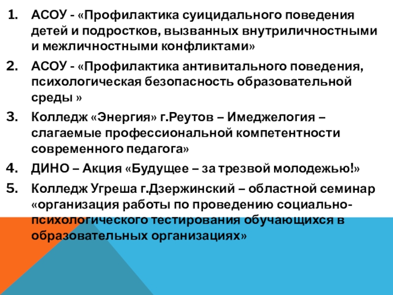 Слайд 10АСОУ - «Профилактика суицидального поведения детей и подростков, вызванных внутриличностными и