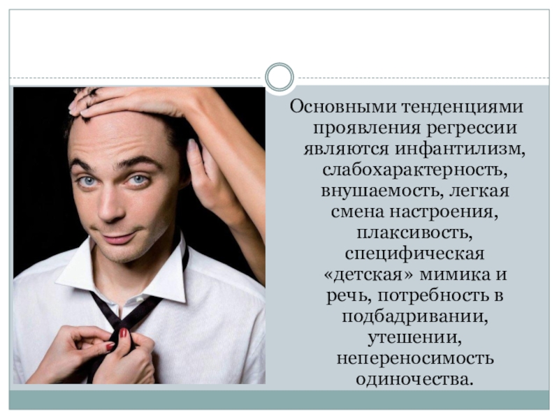 Слайд 5Основными тенденциями проявления регрессии являются инфантилизм, слабохарактерность, внушаемость, легкая смена настроения,