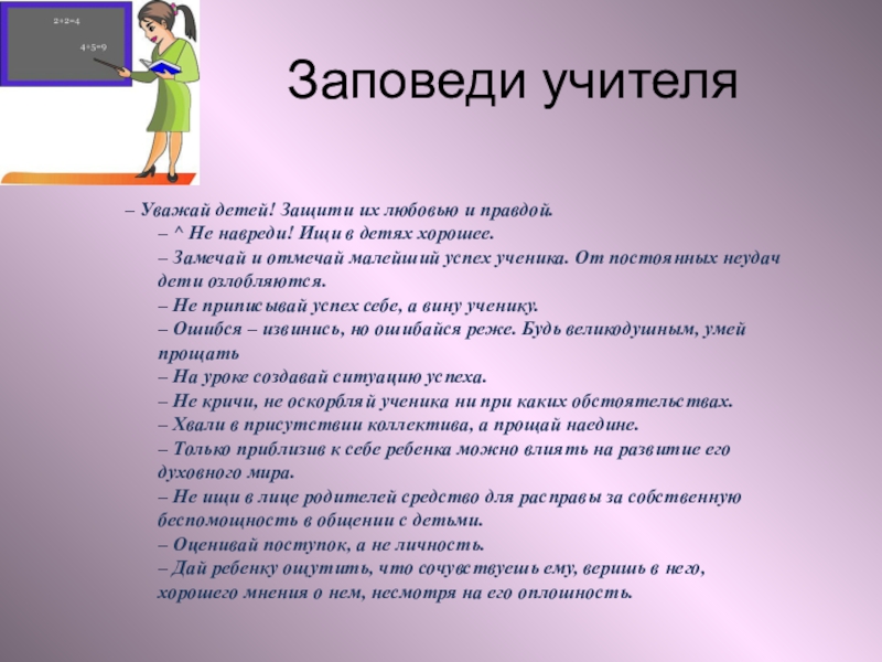 в детях хорошее. – Замечай и отмечай малейший успех ученика. От постоянных неудач дети озлобляются. – Не приписывай успех себе, а вину ученику. – Ошибся – извинись, но ошибайся реже. Будь великодушным, умей прощать – На уроке создавай ситуацию успеха. – Не кричи, не оскорбляй ученика ни при каких обстоятельствах. – Хвали в присутствии коллектива, а прощай наедине. – Только приблизив к себе ребенка можно влиять на развитие его духовного мира. – Не ищи в лице родителей средство для расправы за собственную беспомощность в общении с детьми. – Оценивай поступок, а не личность. – Дай ребенку ощутить, что сочувствуешь ему, веришь в него, хорошего мнения о нем, несмотря на его оплошность.