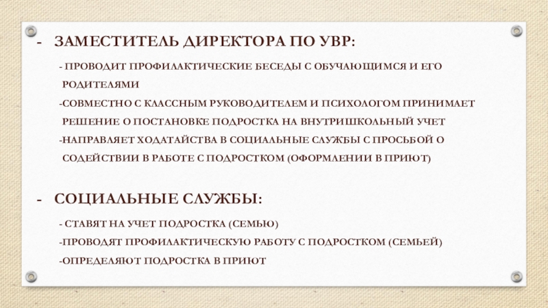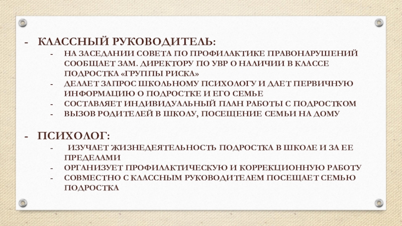 Совместно с классным руководителем и психологом принимает решение о постановке подростка на внутришкольный учет