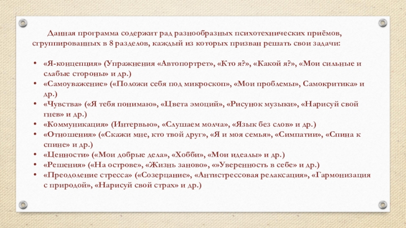 Слайд 13 Данная программа содержит рад разнообразных психотехнических приёмов, сгруппированных в 8 разделов,