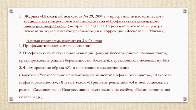 Слайд 14 Журнал «Школьный психолог» № 29, 2004 г. - программа психологического