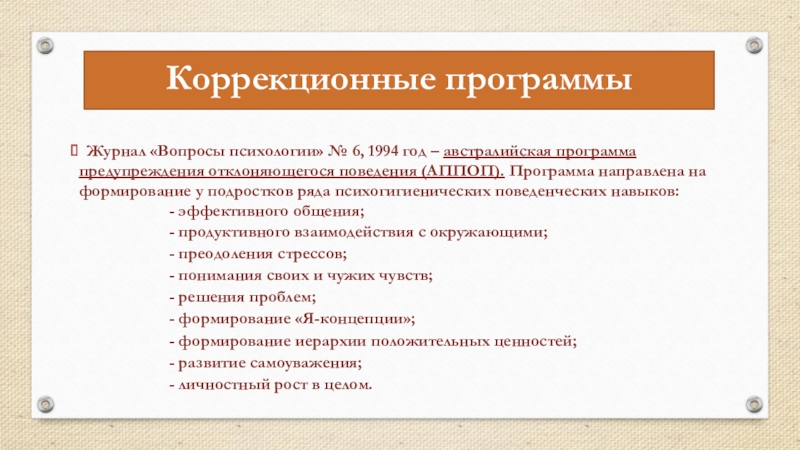 австралийская программа предупреждения отклоняющегося поведения (АППОП). Программа направлена на формирование у подростков ряда психогигиенических поведенческих навыков: