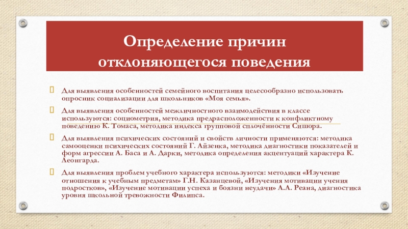 Для выявления проблем учебного характера используются: методики «Изучение отношения к учебным предметам» Г.Н. Казанцевой, «Изучения мотивации учения подростков», «Изучение мотивации успеха и боязни неудачи» А.А. Реана, диагностика уровня школьной тревожности Филипса.