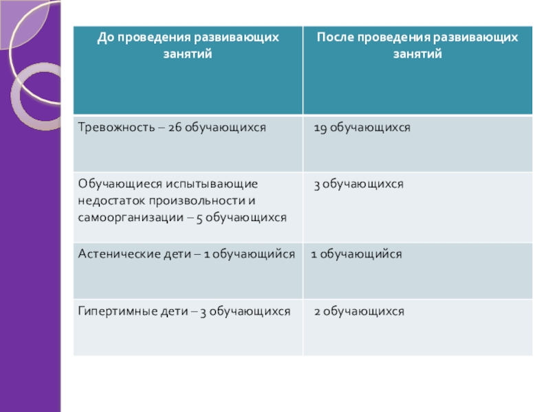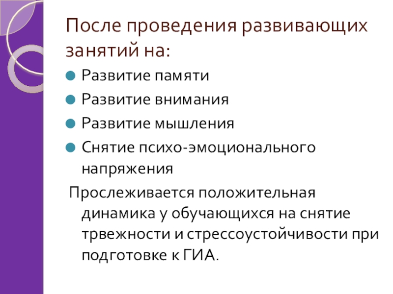 После проведения развивающих занятий на:Развитие памятиРазвитие вниманияРазвитие мышленияСнятие психо-эмоционального напряженияПрослеживается положительная динамика у обучающихся на снятие трвежности