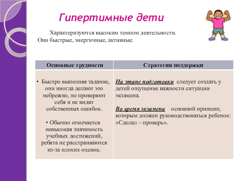 Гипертимные дети	Характеризуются высоким темпом деятельности. Они быстрые, энергичные, активные.