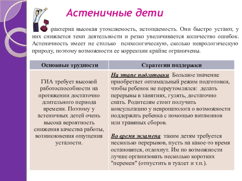 Астеничные дети	Характерна высокая утомляемость, истощаемость. Они быстро устают, у них снижается темп деятельности и резко увеличивается количество