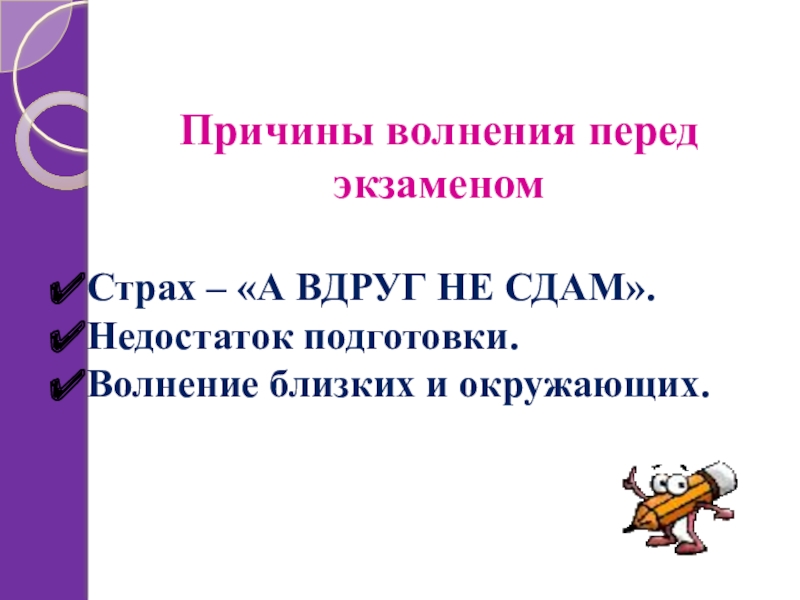 Причины волнения перед экзаменомСтрах – «А ВДРУГ НЕ СДАМ». Недостаток подготовки.Волнение близких и окружающих.