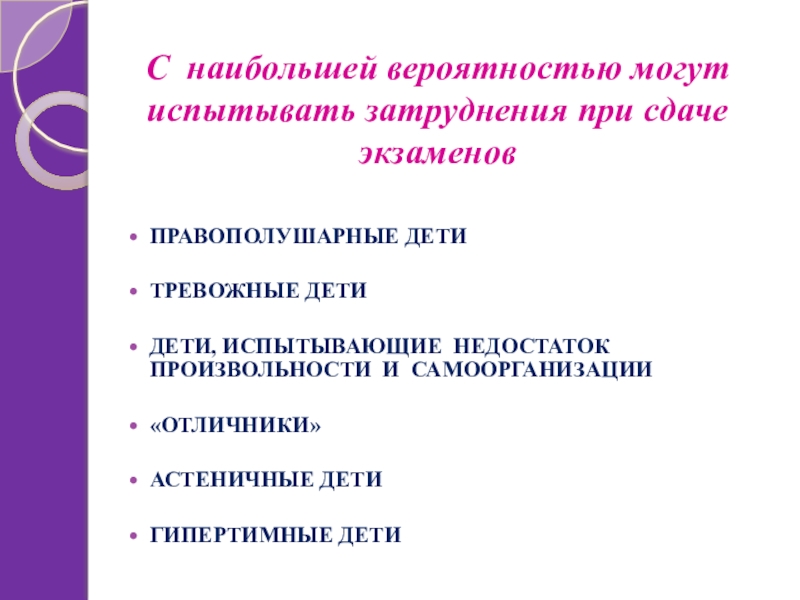 С наибольшей вероятностью могут испытывать затруднения при сдаче экзаменов   ПРАВОПОЛУШАРНЫЕ ДЕТИ	ТРЕВОЖНЫЕ ДЕТИДЕТИ,