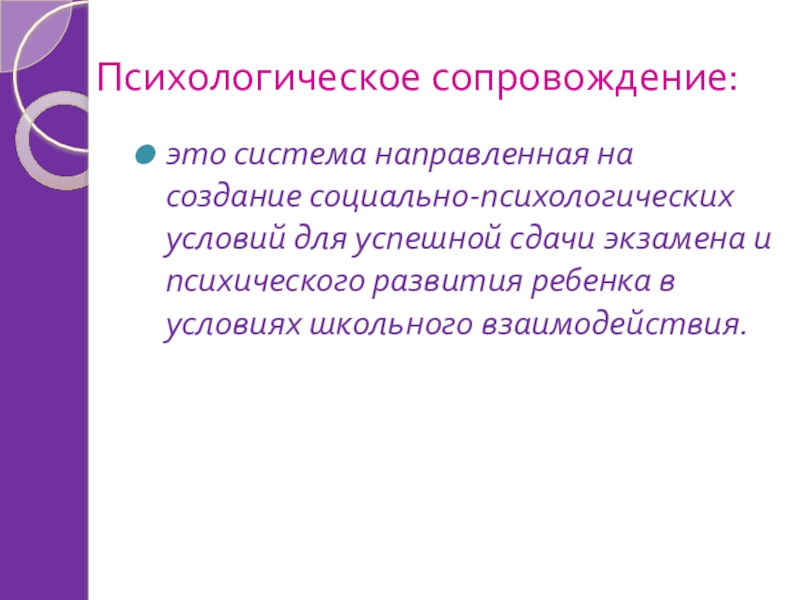 Психологическое сопровождение: это система направленная на создание социально-психологических условий для успешной сдачи экзамена и психического развития ребенка в условиях школьного взаимодействия.