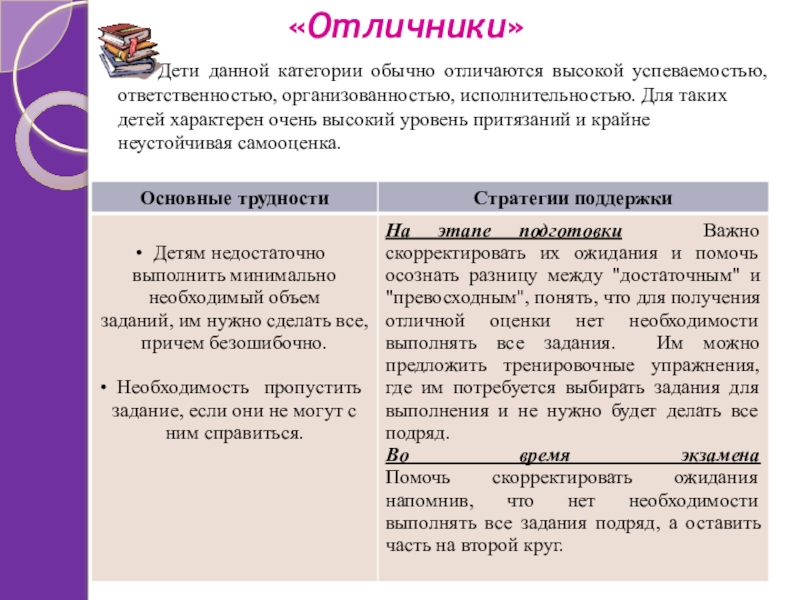 Дети данной категории обычно отличаются высокой успеваемостью, ответственностью, организованностью, исполнительностью. Для