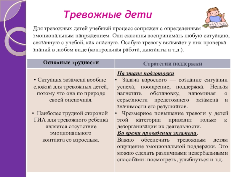 Тревожные детиДля тревожных детей учебный процесс сопряжен с определеннымэмоциональным напряжением. Они склонны воспринимать любую ситуацию, связанную с