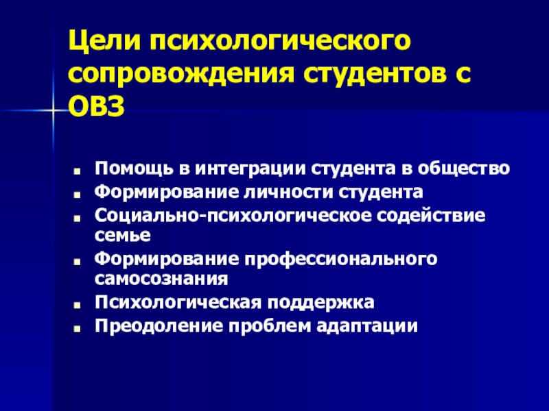 Цели психологического сопровождения студентов с ОВЗПомощь в интеграции студента в обществоФормирование личности студентаСоциально-психологическое содействие семьеФормирование профессионального самосознанияПсихологическая поддержкаПреодоление проблем адаптации