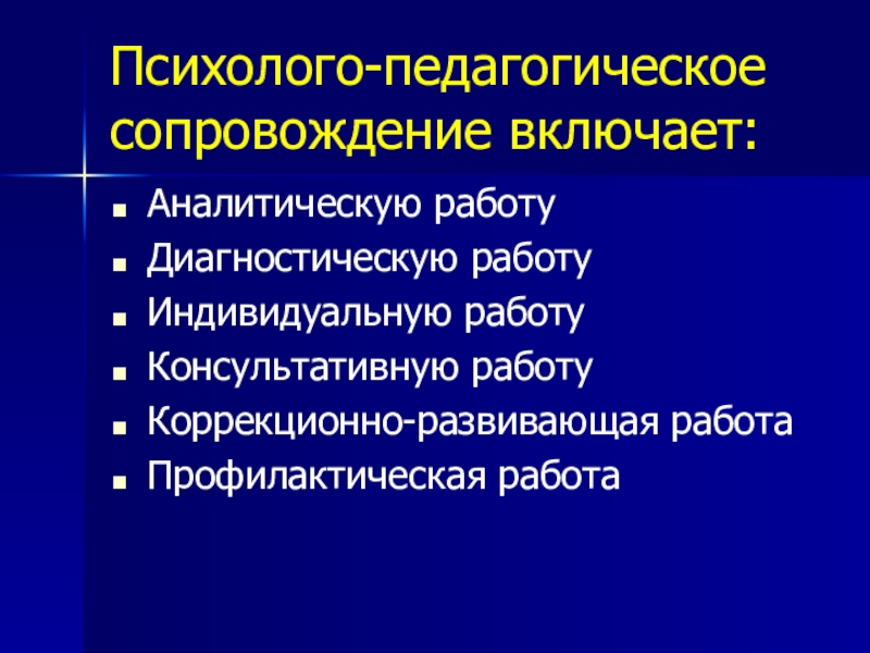 Психолого-педагогическое сопровождение включает:Аналитическую работуДиагностическую работуИндивидуальную работуКонсультативную работуКоррекционно-развивающая работаПрофилактическая работа