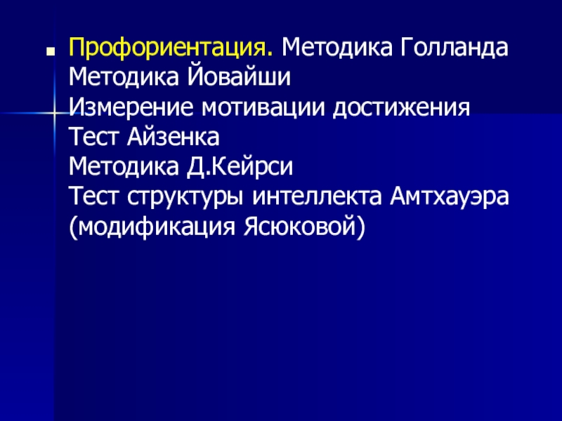 Слайд 12Профориентация. Методика Голланда Методика Йовайши Измерение мотивации достижения Тест Айзенка Методика Д.Кейрси Тест структуры интеллекта Амтхауэра