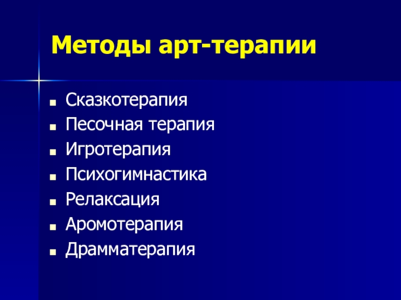 Методы арт-терапииСказкотерапияПесочная терапияИгротерапияПсихогимнастикаРелаксацияАромотерапияДрамматерапия