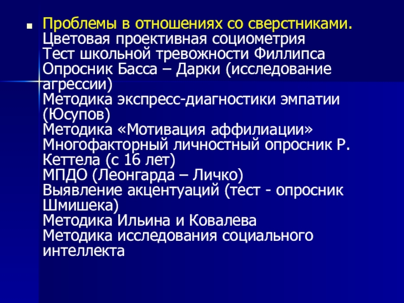 Слайд 10Проблемы в отношениях со сверстниками. Цветовая проективная социометрия Тест школьной тревожности Филлипса Опросник