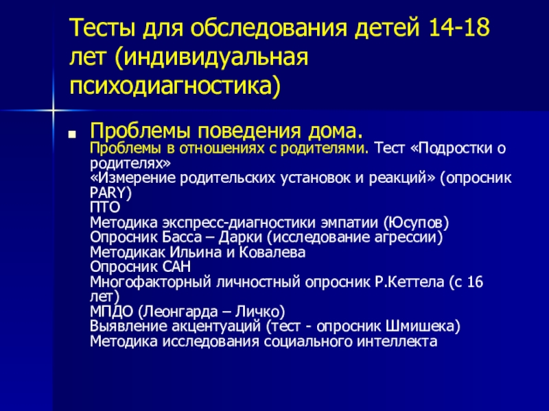 Слайд 8 Тесты для обследования детей 14-18 лет (индивидуальная психодиагностика)