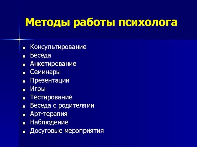 Методы работы психологаКонсультированиеБеседаАнкетированиеСеминарыПрезентацииИгрыТестированиеБеседа с родителямиАрт-терапияНаблюдениеДосуговые мероприятия