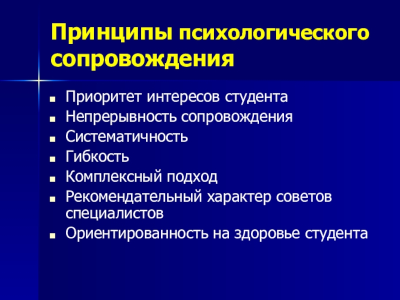 Принципы психологического сопровожденияПриоритет интересов студентаНепрерывность сопровожденияСистематичностьГибкостьКомплексный подходРекомендательный характер советов специалистовОриентированность на здоровье студента