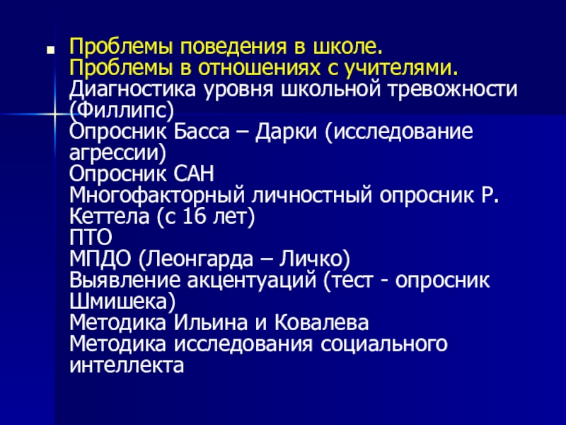 тревожности (Филлипс) Опросник Басса – Дарки (исследование агрессии) Опросник САН Многофакторный личностный опросник Р.Кеттела (с 16 лет) ПТО МПДО (Леонгарда – Личко) Выявление акцентуаций (тест - опросник Шмишека) Методика Ильина и Ковалева Методика исследования социального интеллекта