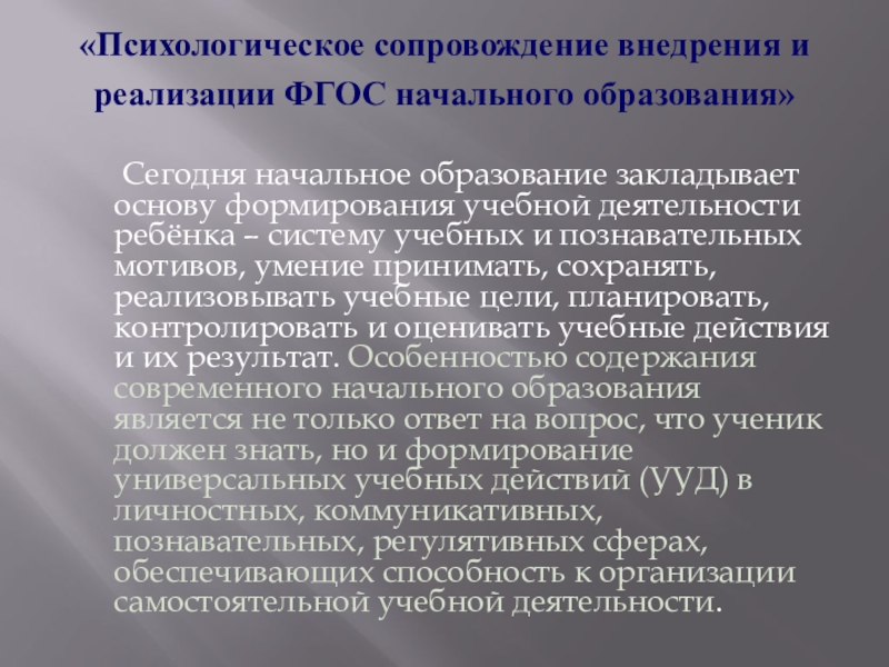 Сегодня начальное образование закладывает основу формирования учебной деятельности ребёнка – систему учебных и познавательных мотивов, умение принимать, сохранять, реализовывать учебные цели, планировать, контролировать и оценивать учебные действия и их результат. Особенностью содержания современного начального образования является не только ответ на вопрос, что ученик должен знать, но и формирование универсальных учебных действий (УУД) в личностных, коммуникативных, познавательных, регулятивных сферах, обеспечивающих способность к организации самостоятельной учебной деятельности.