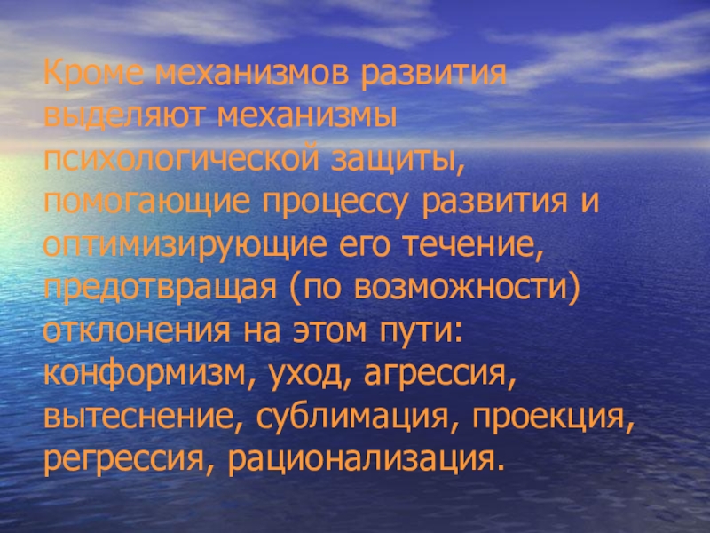 Слайд 25Кроме механизмов развития выделяют механизмы психологической защиты, помогающие процессу развития и